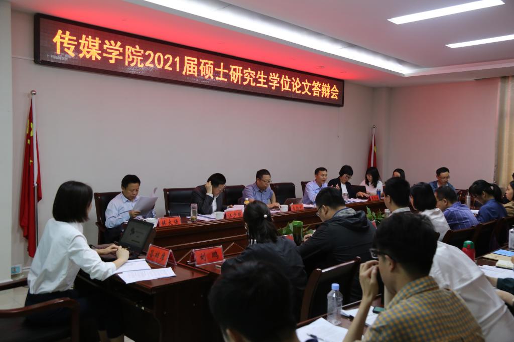 5月25日上午,kaiyun官方网站登录入口在社科楼311会议室举行2021届硕士研究生学位论文答辩会。中国传媒大学博士生导师李胜利教授受邀担任答辩委员会主席,周口师范学院孙红震教授、黄冈师范学院汪少明教授、kaiyun官方网站登录入口院长焦素娥教授以及kaiyun官网部分硕士生导师共同担任答辩委员会委员。13名2021届硕士研究生分两组进行毕业答辩,2019级硕士研究生与会旁听。