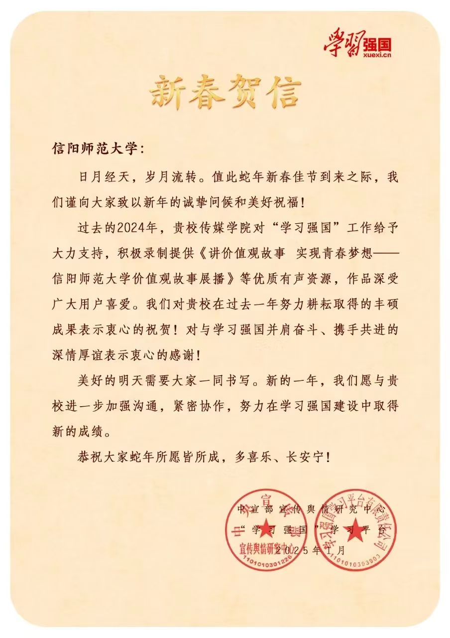 值此农历蛇年新春佳节之际,中宣部宣传舆情研究中心、“学习强国”学习平台发来新春贺信,向我校致以诚挚的新春问候与美好祝福,并对我校国家语言文字推广基地过去一年来在“讲价值观故事”作品创作方面取得的成绩给予高度评价。