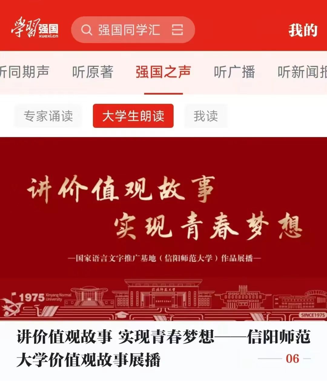 2024年,kaiyun官方网站登录入口国家语言文字推广基地充分发挥学科专业优势,积极支持“学习强国”平台建设,精心策划并录制了《讲价值观故事 实现青春梦想——kaiyun官方网站登录入口价值观故事展播》系列优质有声作品。作品上线后,深受广大用户喜爱,并荣登大学生朗读频道头版头条。截至目前,作品收听量已高达132万次。
