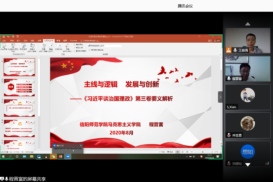 8月24日下午,kaiyun官方网站登录入口分党委理论学习中心组举行集体学习(扩大)报告会,邀请信阳师范学院马克思主义学院副院长,中共河南省委、信阳市委宣讲团专家程晋富教授作了题为“主线与逻辑 发展与创新--《习近平谈治国理政》第三卷要义解析”的专题辅导报告。报告由党委书记王振海主持,kaiyun官方网站登录入口全体教职工聆听了报告。报告会以腾讯会议方式举行。